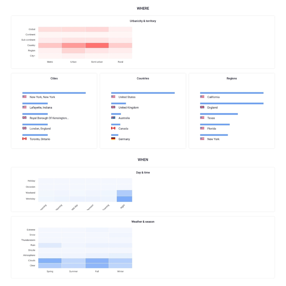 Similarly, the WHEN module shows you the day, time, weather, and season. The heatmap shows when this consumer segment is most active. In the example, weekday evenings and nights are the most active times, indicating that this audience is likely engaged after work hours. Also, you can see that there is less activity during extreme weather events, snow, and thunderstorms.