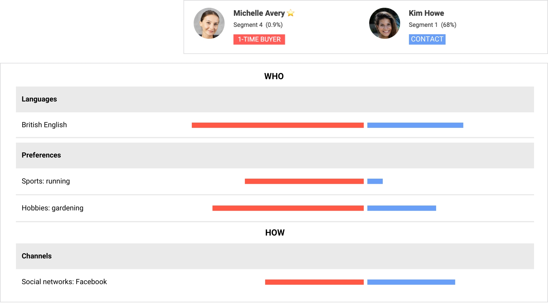 The screenshot compares two buyer persona segments – Michelle Avery, a 1-TIME BUYER (Segment 4), and Kim Howe, a CONTACT (Segment 1). The bars represent their interest across different categories, with Michelle’s in red and Kim’s in blue.